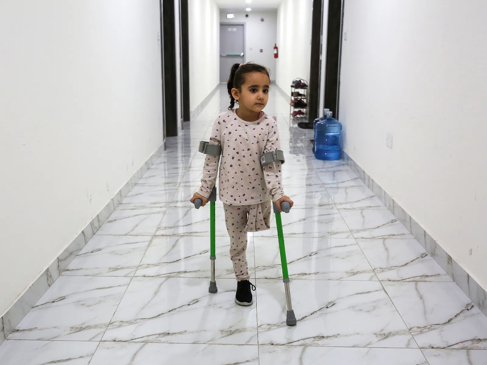 A child supported by crutches in a hallway in an apartment complex. The child is missing one leg from the knee down.