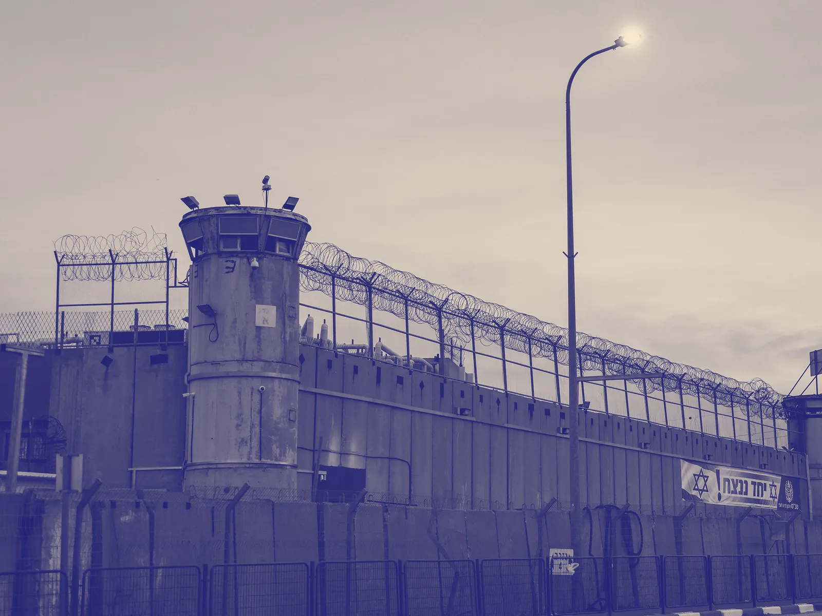 Ofer military prison located between Ramallah and Baytunia in the occupied West Bank. There is a blue tinted overlay on...